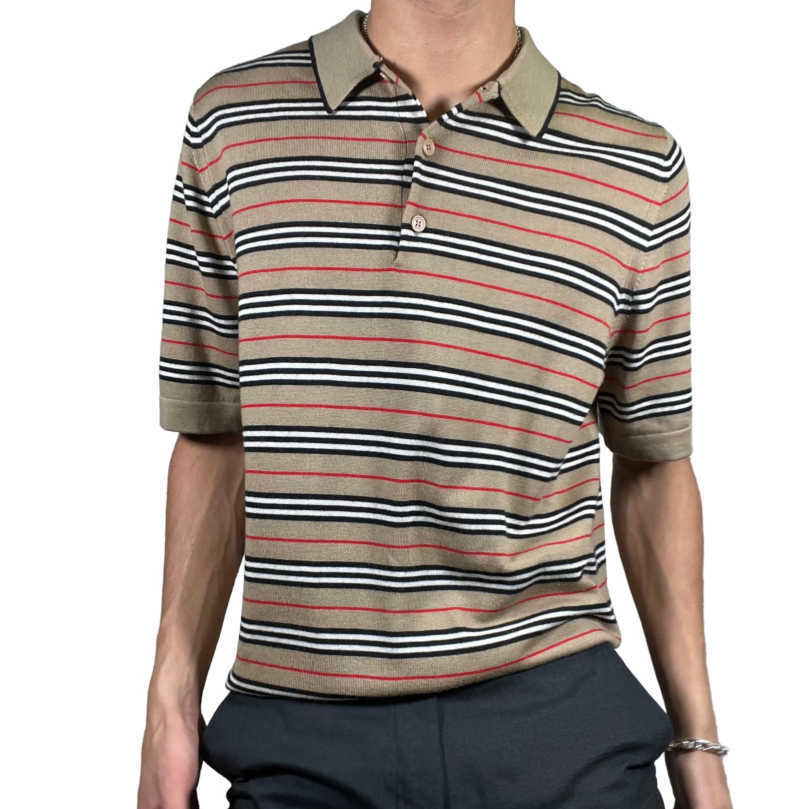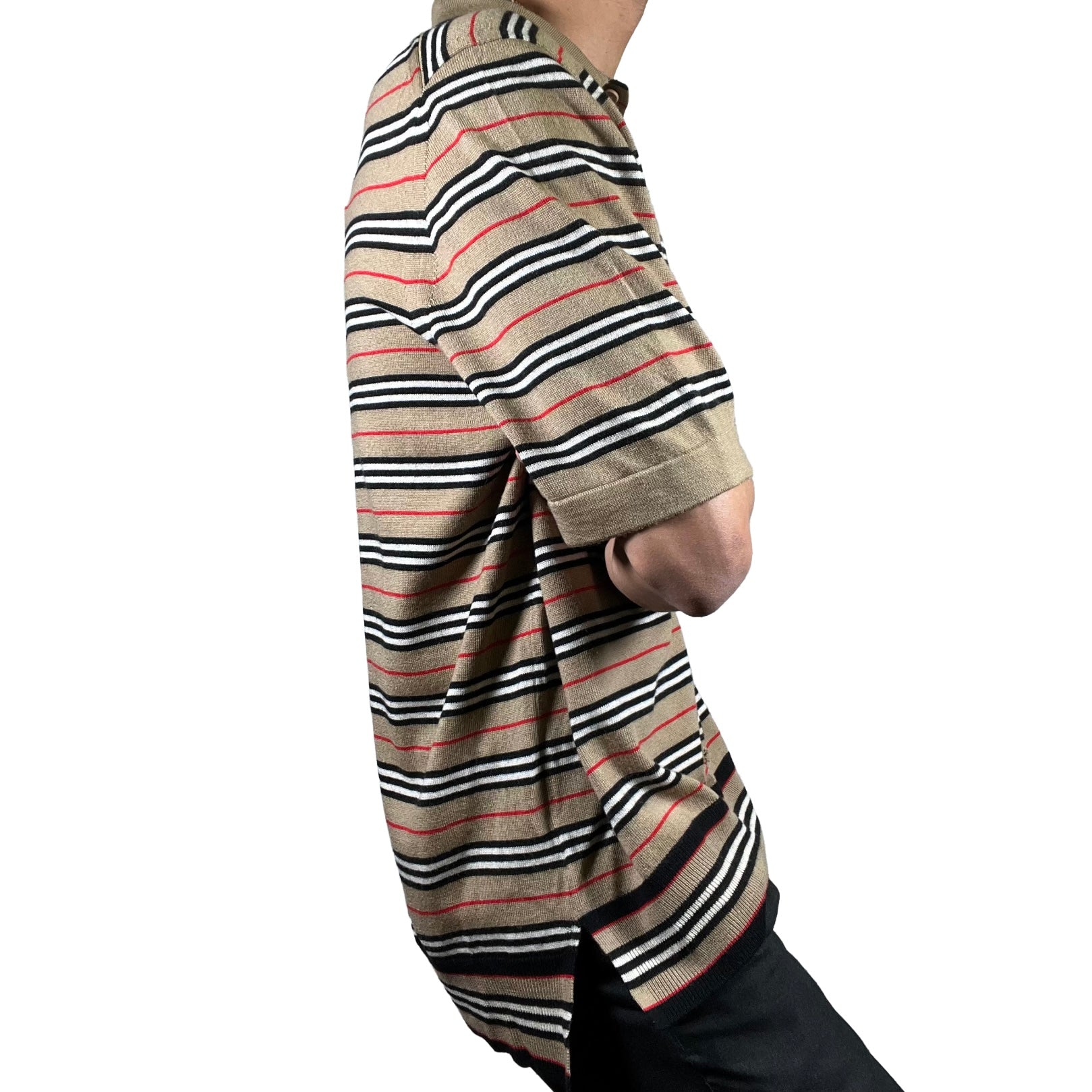 Striped Burberry piké in an archive beige. Made in a soft merino wool and features a three-button closure, classic piké collar, and slouchy fit.