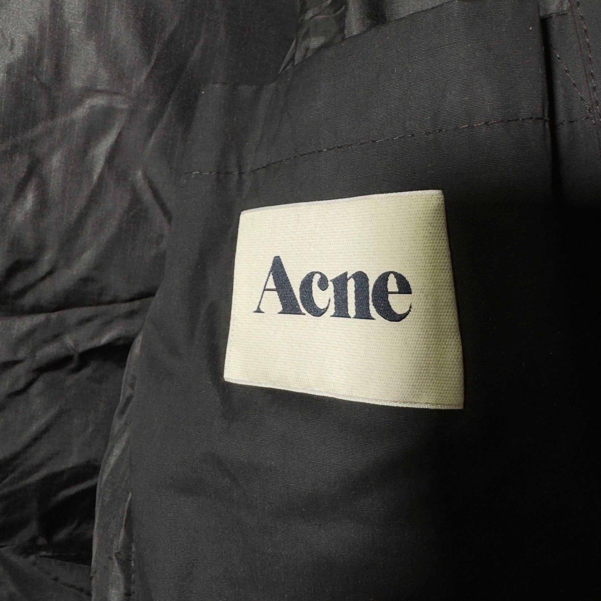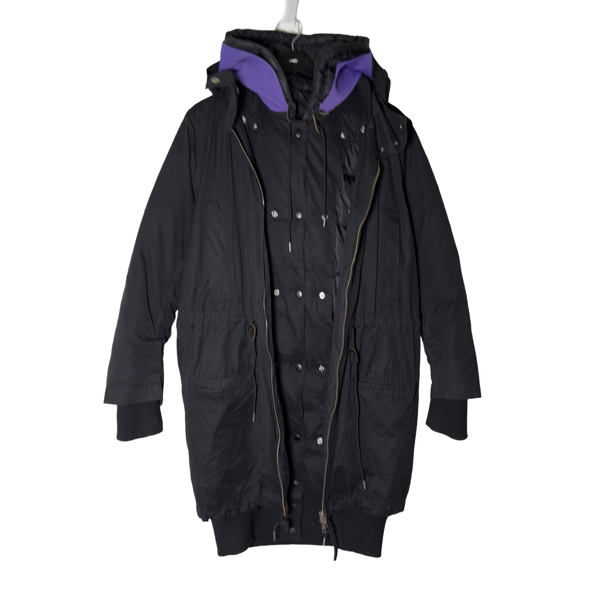 A standout piece from the Autumn/Winter 2012 collection, this Acne Studios "New Snow" parka is a masterclass in functional minimalism and structural design. Constructed from a high-quality, matte technical fabric, it features a unique layered front with a double-zip and button closure for maximum protection against the elements. The jacket is distinguished by its vibrant purple lining inside the hood, offering a sharp pop of color against the deep black exterior. Detailed with an adjustable drawstring waist to taper the oversized silhouette, ribbed storm cuffs, and deep utility pockets, this parka balances a bold, avant-garde volume with practical winter performance.