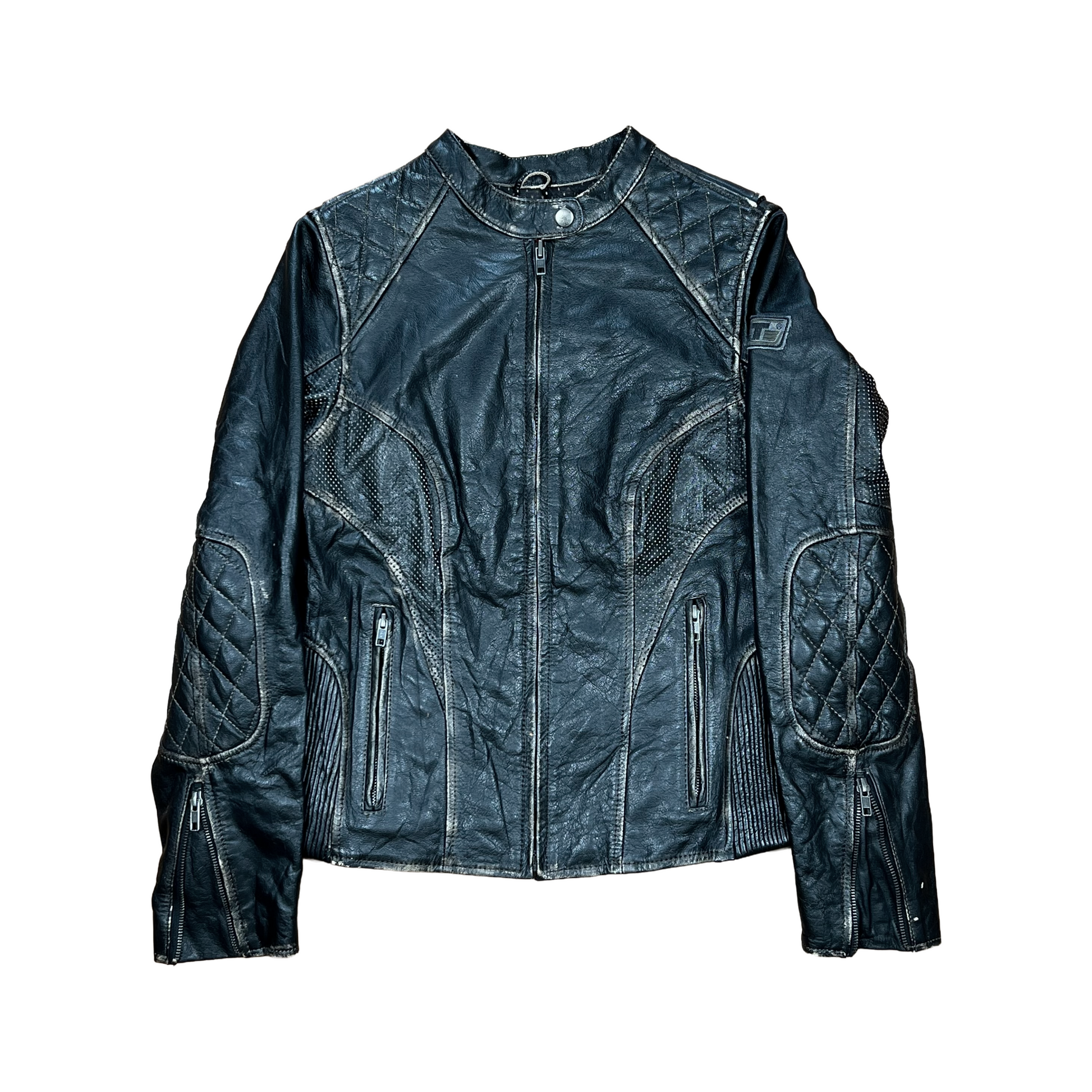 A rugged, broken-in motorcycle jacket from BILT, crafted from durable leather and designed with timeless style in mind. Quilted elbow panels, perforated leather inserts, heavy-duty zippers, zip cuffs, and multiple pockets enhance both function and character. Inside, a breathable mesh lining is finished with bold red BILT branding. Rendered in classic black, it balances toughness with everyday wearability.