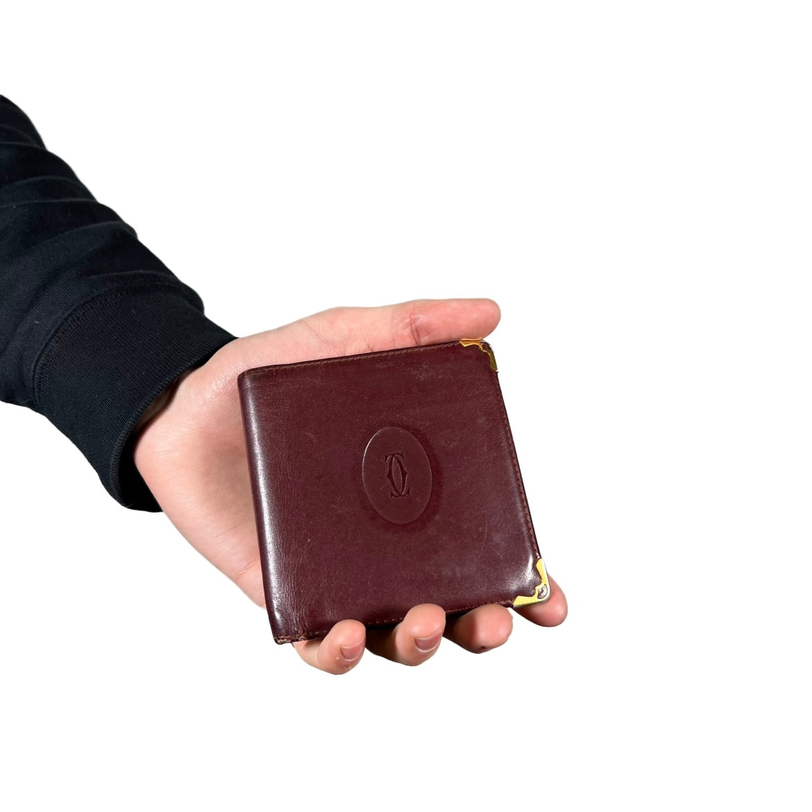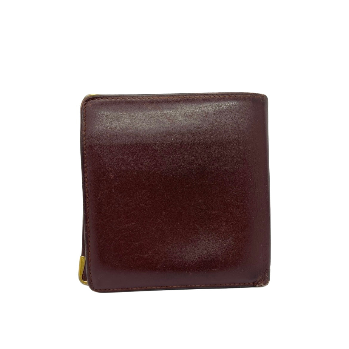 This compact vintage Cartier bifold wallet features rich burgundy calf leather with the iconic embossed "C de Cartier" oval logo on the front, accented by signature gold-tone metal corner protectors. Classic square shape, typical of 80s/90s Must de Cartier pieces – shows authentic patina and wear consistent with age.