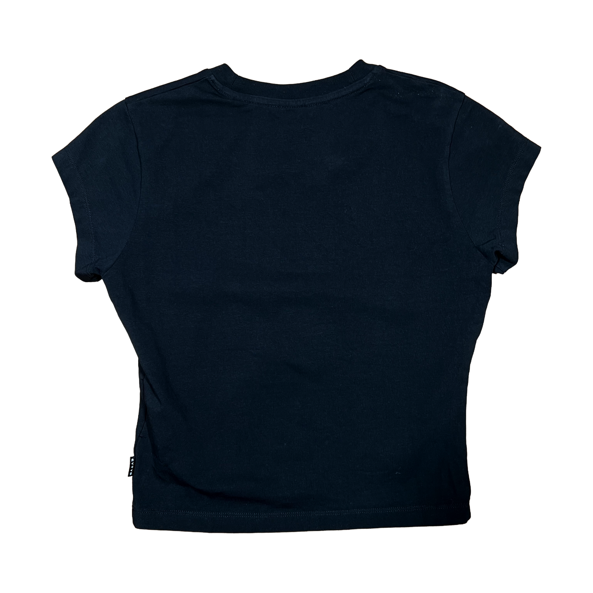 From Eytys’ playful graphic line, this “Extra Virgin” tee combines tongue-in-cheek branding with a fitted, cropped silhouette—an example of the label’s early 2010s streetwear-meets-art direction. Produced in Portugal.