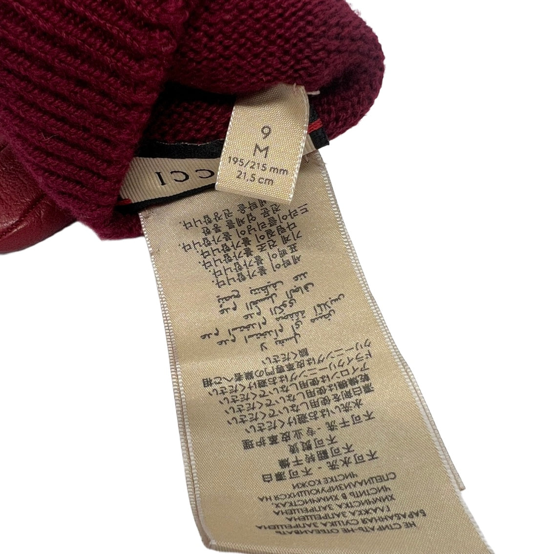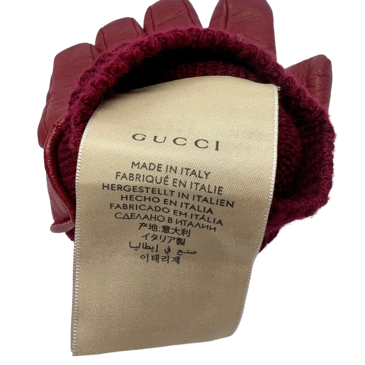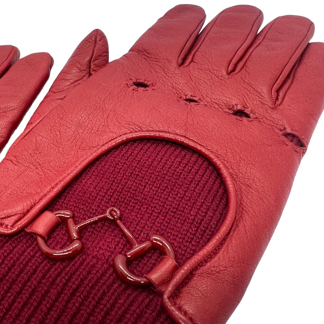 Crafted in Italy, these gloves feature a sophisticated blend of deep red leather and tonal ribbed knit cuffs. The design is elevated by the iconic Gucci Horsebit detail in a matching lacquered finish, offering a modern take on the house's equestrian heritage. Perforated knuckle details add a classic driving glove aesthetic, while the wool-blend lining ensures warmth and comfort.