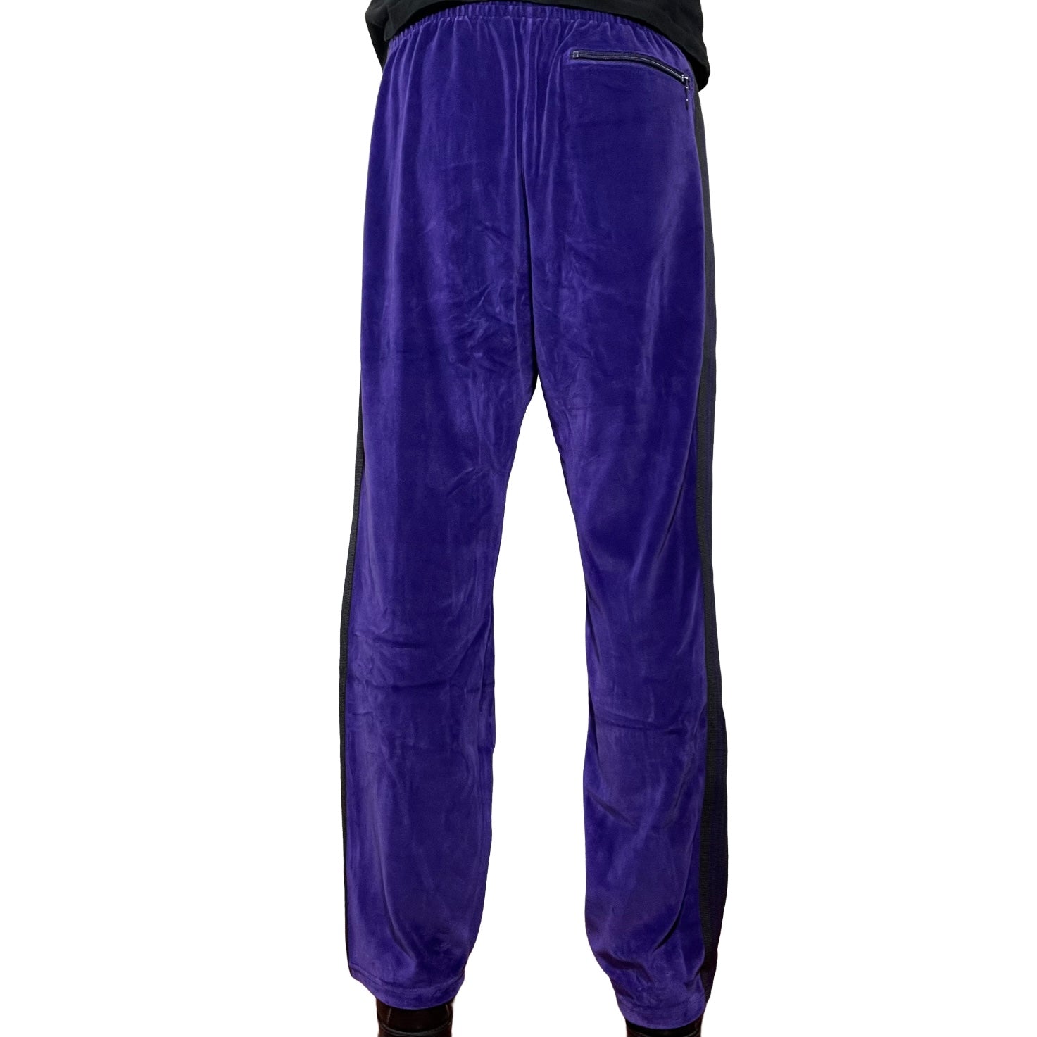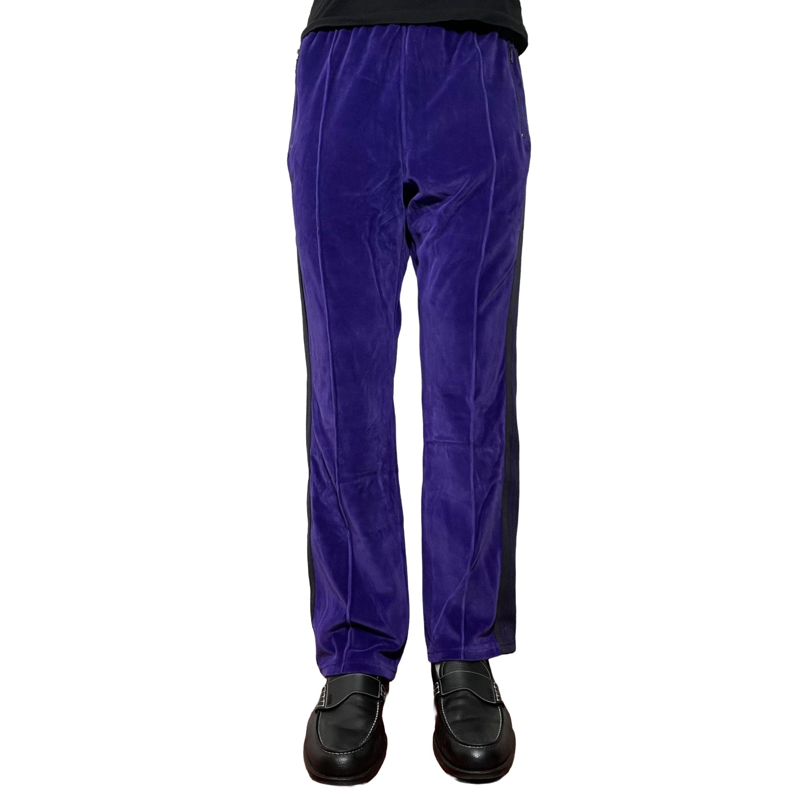Cotton-blend velour track pants from Needles. The pants feature a concealed drawstring at the waistband, 3 zip pockets, logo graphic embroidered at front, and striped webbing trim at outseams.