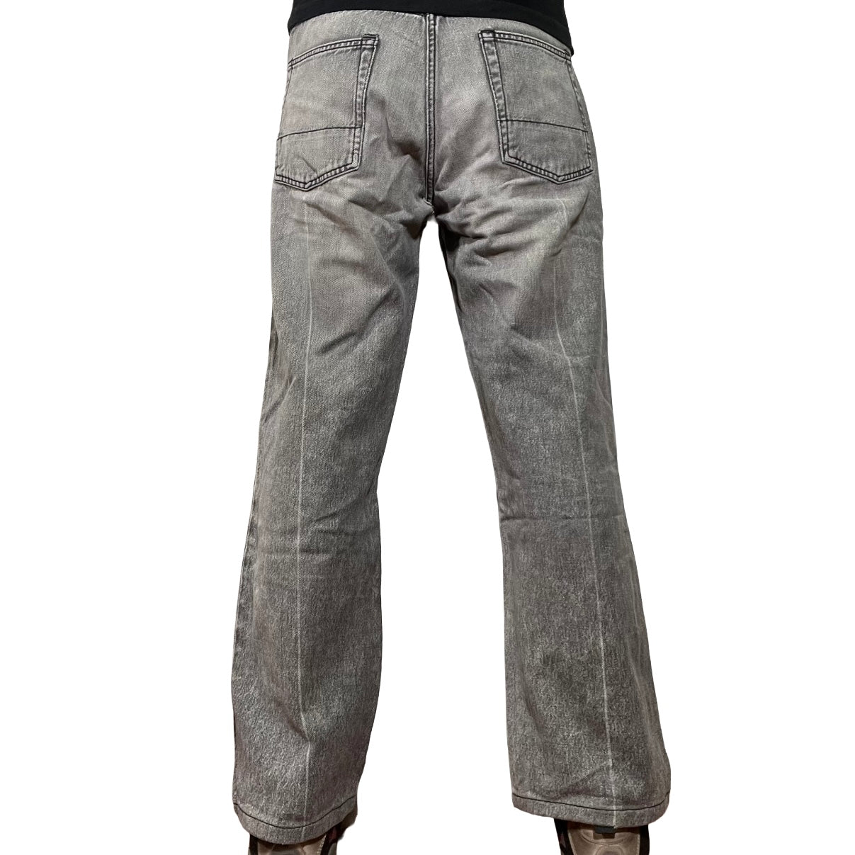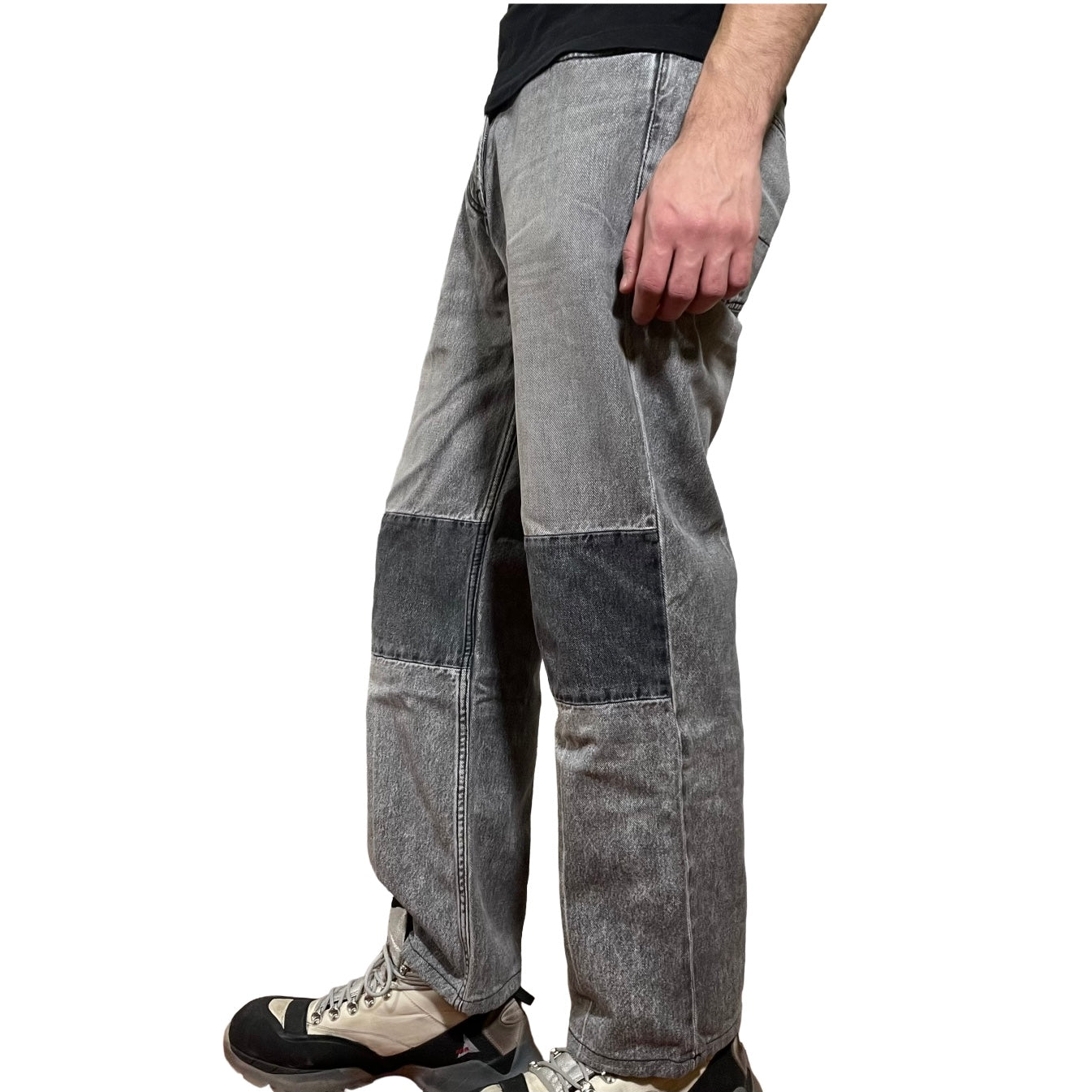 Our Legacy Extended Third Cut in black and grey. Produced in a vintage washed denim, the mens Extended Third Cut jeans have a relaxed, wide legged fit and feature a contrast stitched knee panel, pressed creases, a YKK zip fly, metal rivets and reinforced back pockets.