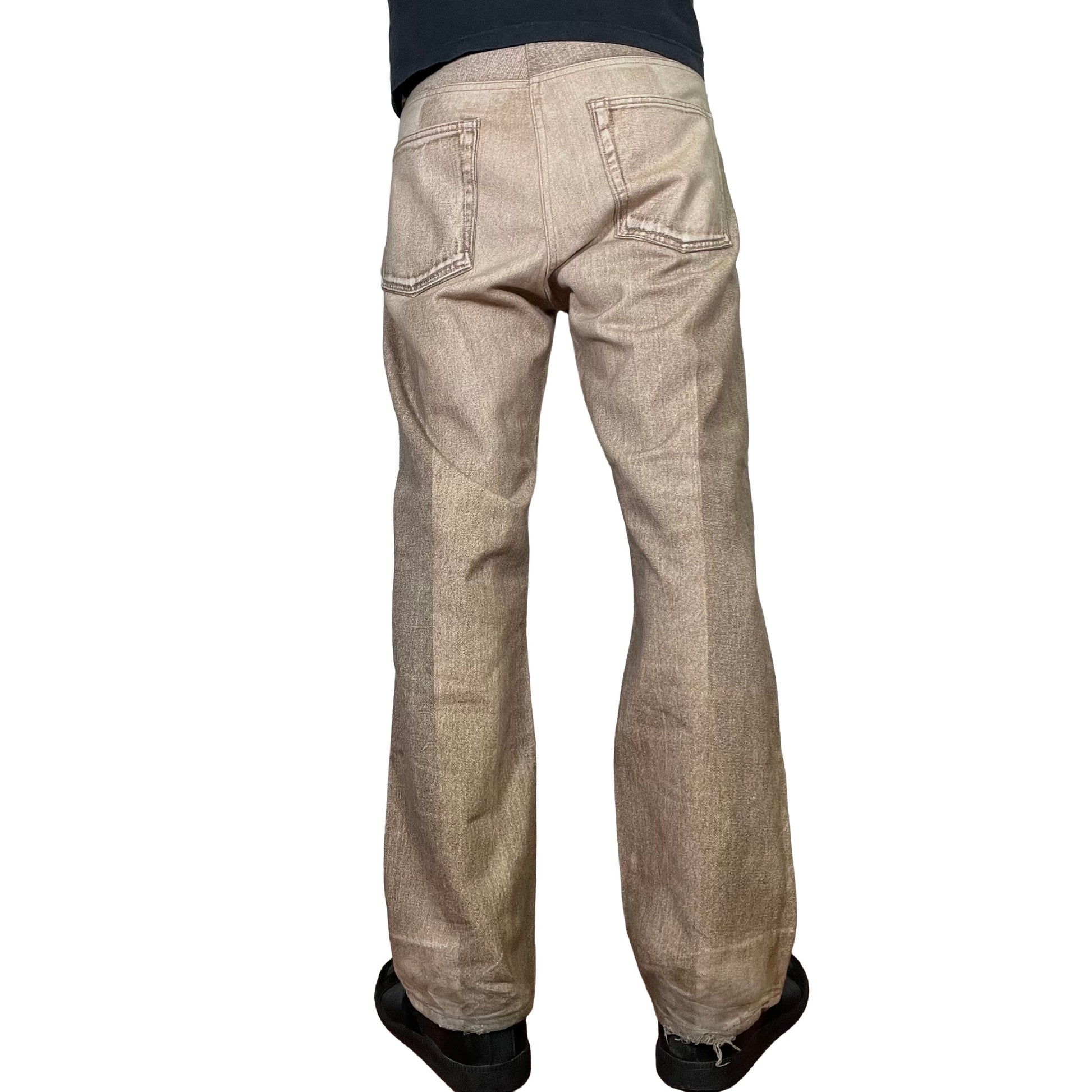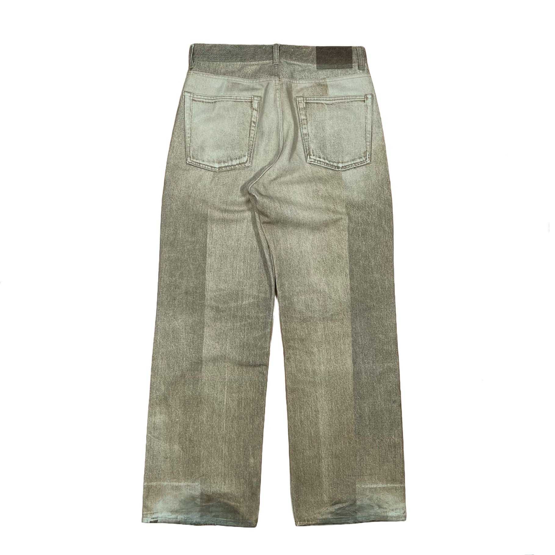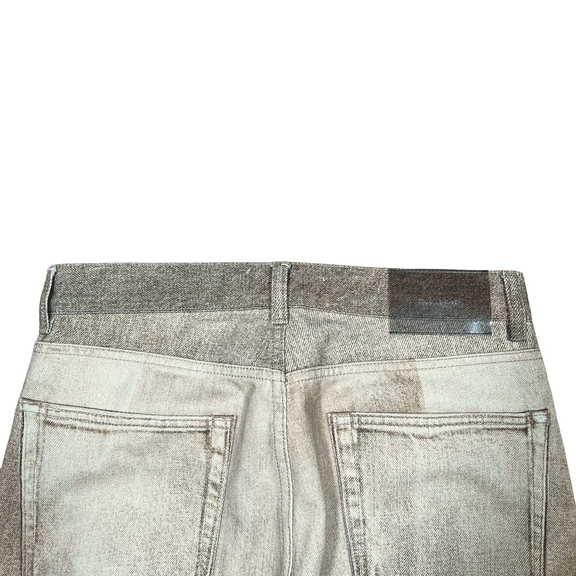 Constructed from 100% cotton denim with a distinctive digitally printed wash effect, giving the jeans a worn-in, sun-faded appearance. Features a classic five-pocket setup, button fly, and straight leg cut with raw, distressed hems.