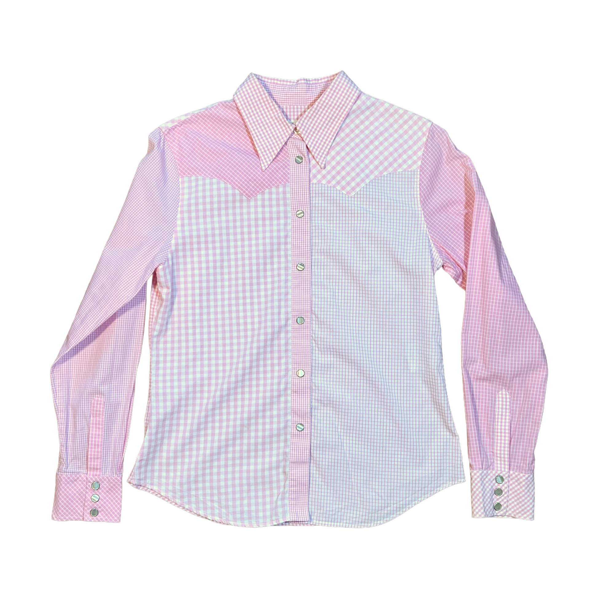 Crafted from lightweight cotton, this Western shirt features a mixed pink gingham panel construction with snap button closure and pointed collar. Designed with contrast yokes and double button cuffs, it merges playful colors with classic Western detailing.